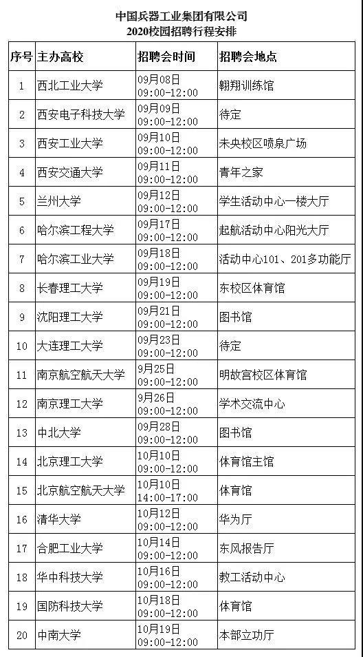 中國兵器工業(yè)集團(tuán)2020屆校園招聘會將在全國12個城市、20所高校舉辦,招聘會具體行程見下表: