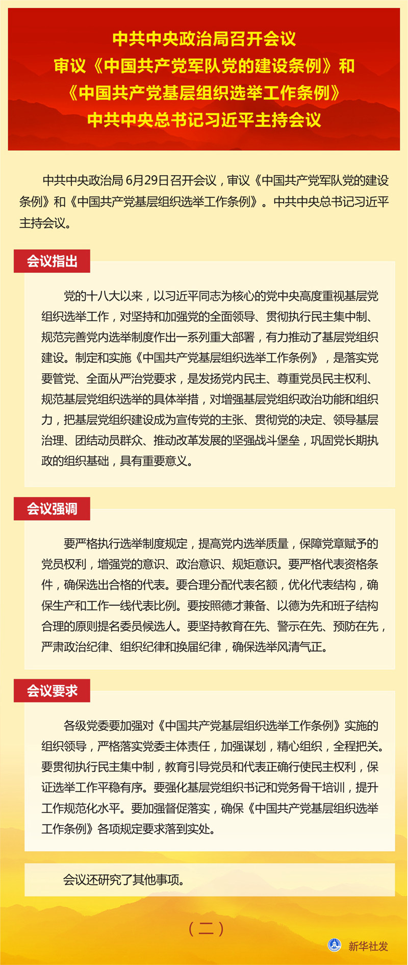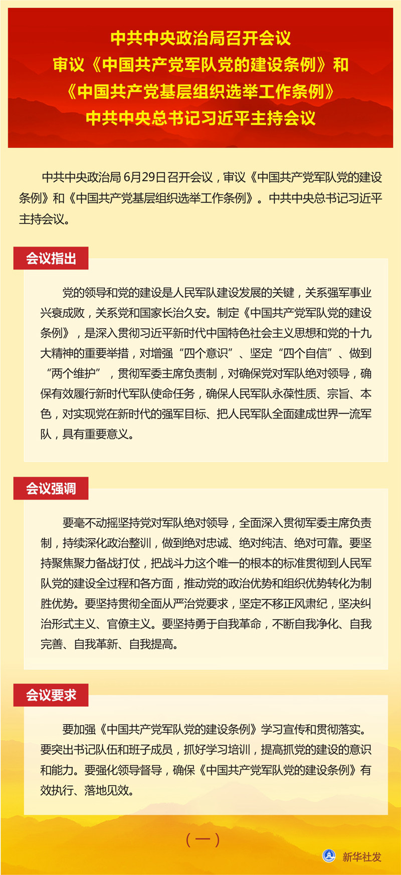 中共中央政治局召開會議 審議《中國共產(chǎn)黨軍隊黨的建設(shè)條例》和《中國共產(chǎn)黨基層組織選舉工作條例》 中共中央總書記習(xí)近平主持會議 新華社北京6月29日電 中共中央政治局6月29日召開會議,審議《中國共產(chǎn)黨軍隊黨的建設(shè)條例》和《中國共產(chǎn)黨基層組織選舉工作條例》。中共中央總書記習(xí)近平主持會議。 會議指出,黨的領(lǐng)導(dǎo)和黨的建設(shè)是人民軍隊建設(shè)發(fā)展的關(guān)鍵,關(guān)系強軍事業(yè)興衰成敗,關(guān)系黨和國家長治久安。制定《中國共產(chǎn)黨軍隊黨的建設(shè)條例》,是深入貫徹習(xí)近平新時代中國特色社會主義思想和黨的十九大精神的重要舉措,對增強“四個意識”、堅定“四個自信”、做到“兩個維護”,貫徹軍委主席負責(zé)制,對確保黨對軍隊絕對領(lǐng)導(dǎo),確保有效履行新時代軍隊使命任務(wù),確保人民軍隊永葆性質(zhì)、宗旨、本色,對實現(xiàn)黨在新時代的強軍目標(biāo)、把人民軍隊全面建成世界一流軍隊,具有重要意義。 會議強調(diào),要毫不動搖堅持黨對軍隊絕對領(lǐng)導(dǎo),全面深入貫徹軍委主席負責(zé)制,持續(xù)深化政治整訓(xùn),做到絕對忠誠、絕對純潔、絕對可靠。要堅持聚焦聚力備戰(zhàn)打仗,把戰(zhàn)斗力這個唯一的根本的標(biāo)準(zhǔn)貫徹到人民軍隊黨的建設(shè)全過程和各方面,推動黨的政治優(yōu)勢和組織優(yōu)勢轉(zhuǎn)化為制勝優(yōu)勢。要堅持貫徹全面從嚴(yán)治黨要求,堅定不移正風(fēng)肅紀(jì),堅決糾治形式主義、官僚主義。要堅持勇于自我革命,不斷自我凈化、自我完善、自我革新、自我提高。 會議要求,要加強《中國共產(chǎn)黨軍隊黨的建設(shè)條例》學(xué)習(xí)宣傳和貫徹落實。要突出書記隊伍和班子成員,抓好學(xué)習(xí)培訓(xùn),提高抓黨的建設(shè)的意識和能力。要強化領(lǐng)導(dǎo)督導(dǎo),確保《中國共產(chǎn)黨軍隊黨的建設(shè)條例》有效執(zhí)行、落地見效。 會議指出,黨的十八大以來,以習(xí)近平同志為核心的黨中央高度重視基層黨組織選舉工作,對堅持和加強黨的全面領(lǐng)導(dǎo)、貫徹執(zhí)行民主集中制、規(guī)范完善黨內(nèi)選舉制度作出一系列重大部署,有力推動了基層黨組織建設(shè)。制定和實施《中國共產(chǎn)黨基層組織選舉工作條例》,是落實黨要管黨、全面從嚴(yán)治黨要求,是發(fā)揚黨內(nèi)民主、尊重黨員民主權(quán)利、規(guī)范基層黨組織選舉的具體舉措,對增強基層黨組織政治功能和組織力,把基層黨組織建設(shè)成為宣傳黨的主張、貫徹黨的決定、領(lǐng)導(dǎo)基層治理、團結(jié)動員群眾、推動改革發(fā)展的堅強戰(zhàn)斗堡壘,鞏固黨長期執(zhí)政的組織基礎(chǔ),具有重要意義。 會議強調(diào),要嚴(yán)格執(zhí)行選舉制度規(guī)定,提高黨內(nèi)選舉質(zhì)量,保障黨章賦予的黨員權(quán)利,增強黨的意識、政治意識、規(guī)矩意識。要嚴(yán)格代表資格條件,確保選出合格的代表。要合理分配代表名額,優(yōu)化代表結(jié)構(gòu),確保生產(chǎn)和工作一線代表比例。要按照德才兼?zhèn)洹⒁缘聻橄群桶嘧咏Y(jié)構(gòu)合理的原則提名委員候選人。要堅持教育在先、警示在先、預(yù)防在先,嚴(yán)肅政治紀(jì)律、組織紀(jì)律和換屆紀(jì)律,確保選舉風(fēng)清氣正。 會議要求,各級黨委要加強對《中國共產(chǎn)黨基層組織選舉工作條例》實施的組織領(lǐng)導(dǎo),嚴(yán)格落實黨委主體責(zé)任,加強謀劃,精心組織,全程把關(guān)。要貫徹執(zhí)行民主集中制,教育引導(dǎo)黨員和代表正確行使民主權(quán)利,保證選舉工作平穩(wěn)有序。要強化基層黨組織書記和黨務(wù)骨干培訓(xùn),提升工作規(guī)范化水平。要加強督促落實,確?!吨袊伯a(chǎn)黨基層組織選舉工作條例》各項規(guī)定要求落到實處。 會議還研究了其他事項。 |