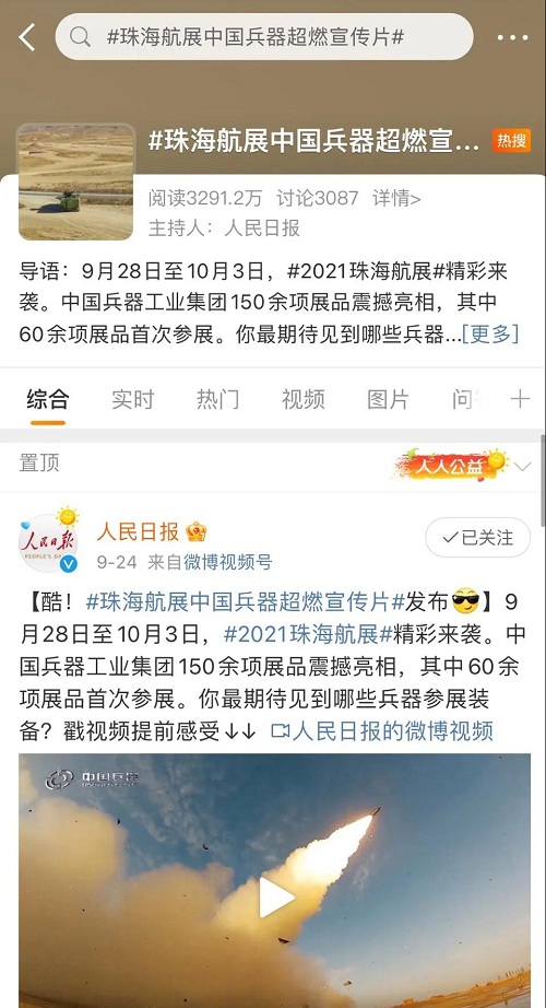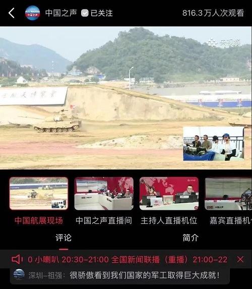 人民日?qǐng)?bào)、新華社、中國(guó)日?qǐng)?bào)、共青團(tuán)中央、國(guó)資小新、騰訊軍事、鳳凰軍事、新浪軍事等新媒體發(fā)布的集團(tuán)公司航展宣傳片等視頻作品燃爆全網(wǎng),閱讀量突破三千萬(wàn)人次,得到外交部發(fā)言人趙立堅(jiān)轉(zhuǎn)載點(diǎn)贊。集團(tuán)公司微信、微博、抖音號(hào)、微信視頻號(hào)等新媒體宣傳片播放閱讀量超過(guò)400萬(wàn)人次。同時(shí),央視新聞、新華社、中國(guó)之聲、央視軍事、央視新媒體、解放軍報(bào)、共青團(tuán)中央、國(guó)資小新、環(huán)球時(shí)報(bào)等多家媒體對(duì)集團(tuán)公司靜、動(dòng)態(tài)展區(qū)進(jìn)行現(xiàn)場(chǎng)直播,在電視端、客戶端、微信視頻號(hào)、微博、B站、快手、抖音等平臺(tái)受到高度關(guān)注。著名軍事專家杜文龍、央視主持人顧國(guó)寧、央廣中國(guó)之聲主持人王藝等直播兵器館、動(dòng)態(tài)表演區(qū)裝備。