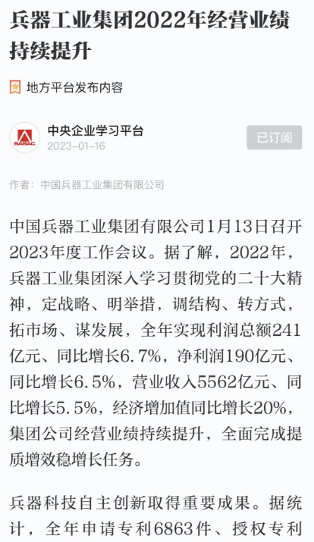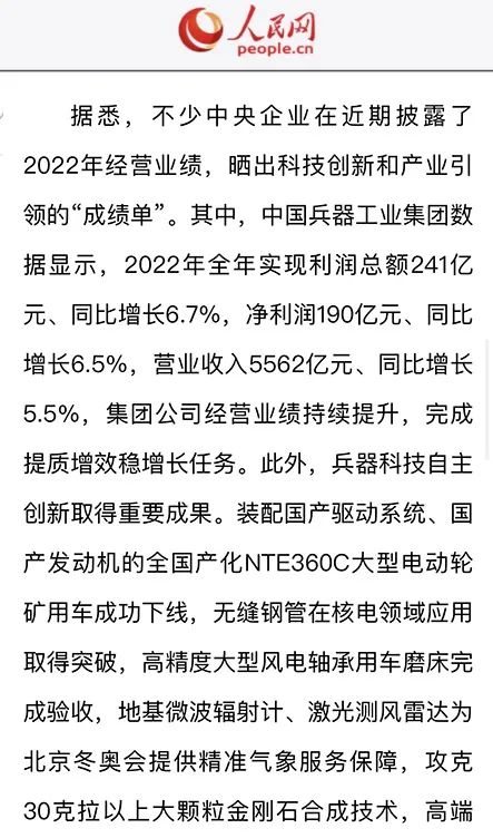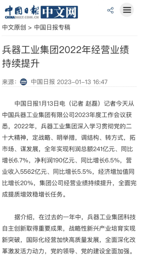 1月13日,中國(guó)兵器工業(yè)集團(tuán)有限公司召開2023年度工作會(huì)議,傳達(dá)學(xué)習(xí)中央領(lǐng)導(dǎo)同志、軍方首長(zhǎng)和上級(jí)部門重要批示,總結(jié)集團(tuán)公司2022年工作,研究部署2023年主要工作任務(wù)。 集團(tuán)公司2022年重點(diǎn)工作取得的成績(jī)及下一步的改革發(fā)展受到社會(huì)媒體廣泛關(guān)注。新華社、新華財(cái)經(jīng)、人民網(wǎng)、經(jīng)濟(jì)日?qǐng)?bào)客戶端、光明日?qǐng)?bào)客戶端、中國(guó)日?qǐng)?bào)網(wǎng)、中國(guó)科技網(wǎng)、中國(guó)新聞網(wǎng)、央廣網(wǎng)、國(guó)資委網(wǎng)站、學(xué)習(xí)強(qiáng)國(guó)中央企業(yè)學(xué)習(xí)平臺(tái)、新浪網(wǎng)、騰訊網(wǎng)、搜狐網(wǎng)、網(wǎng)易網(wǎng)、今日頭條等中央主流媒體、國(guó)家部委網(wǎng)站及知名網(wǎng)絡(luò)媒體對(duì)集團(tuán)公司工作會(huì)議進(jìn)行了報(bào)道,重點(diǎn)關(guān)注集團(tuán)公司高質(zhì)量發(fā)展、科技創(chuàng)新、戰(zhàn)略性新興產(chǎn)業(yè)培育、深化改革、國(guó)際化經(jīng)營(yíng)、履行央企社會(huì)責(zé)任等內(nèi)容。其中新華社以《北斗時(shí)空智能服務(wù)平臺(tái)累計(jì)服務(wù)終端數(shù)突破15億》為題,重點(diǎn)報(bào)道了集團(tuán)公司2022年在自主創(chuàng)新、戰(zhàn)略新興產(chǎn)業(yè)培育、專利申請(qǐng)等方面取得的成績(jī);經(jīng)濟(jì)日?qǐng)?bào)客戶端、光明日?qǐng)?bào)客戶端、中國(guó)日?qǐng)?bào)網(wǎng)等以《兵器工業(yè)集團(tuán)2022年經(jīng)營(yíng)業(yè)績(jī)持續(xù)提升》為題,重點(diǎn)報(bào)道了集團(tuán)公司在高質(zhì)量發(fā)展、全面完成提質(zhì)增效穩(wěn)增長(zhǎng)方面取得的成績(jī)。集團(tuán)公司門戶網(wǎng)站、微信公眾號(hào)、微博等新媒體也對(duì)集團(tuán)公司工作會(huì)議進(jìn)行了及時(shí)報(bào)道,各成員單位紛紛對(duì)相關(guān)內(nèi)容進(jìn)行轉(zhuǎn)載,引發(fā)全系統(tǒng)關(guān)注。 新華社:北斗時(shí)空智能服務(wù)平臺(tái)累計(jì)服務(wù)終端數(shù)突破15億 新華財(cái)經(jīng):兵器工業(yè)集團(tuán)2022年實(shí)現(xiàn)凈利潤(rùn)190億元 同比增長(zhǎng)6.5% 人民網(wǎng):2022年中央企業(yè)營(yíng)收同比增長(zhǎng)8.3% 科技創(chuàng)新成效顯著 經(jīng)濟(jì)日?qǐng)?bào)客戶端:兵器工業(yè)集團(tuán)2022年經(jīng)營(yíng)業(yè)績(jī)持續(xù)提升 光明日?qǐng)?bào)客戶端:兵器工業(yè)集團(tuán)2022年經(jīng)營(yíng)業(yè)績(jī)持續(xù)提升 中國(guó)日?qǐng)?bào)網(wǎng):兵器工業(yè)集團(tuán)2022年經(jīng)營(yíng)業(yè)績(jī)持續(xù)提升 中國(guó)科技網(wǎng):兵器工業(yè)集團(tuán)2022年實(shí)現(xiàn)利潤(rùn)總額241億元 中國(guó)新聞網(wǎng):2022年兵器工業(yè)集團(tuán)實(shí)現(xiàn)利潤(rùn)總額241億元 同比增長(zhǎng)6.7% 國(guó)資委網(wǎng)站:2022年兵器工業(yè)集團(tuán)實(shí)現(xiàn)利潤(rùn)總額241億元 同比增長(zhǎng)6.7% 學(xué)習(xí)強(qiáng)國(guó)中央企業(yè)學(xué)習(xí)平臺(tái):兵器工業(yè)集團(tuán)2022年經(jīng)營(yíng)業(yè)績(jī)持續(xù)提升 集團(tuán)公司職工及廣大網(wǎng)友熱議工作會(huì)議 “這次會(huì)議全面總結(jié)了2022年工作,深入分析研判當(dāng)前形勢(shì),部署2023年重點(diǎn)工作,為我們做好2023年及今后一個(gè)時(shí)期的工作明確了目標(biāo)、堅(jiān)定了信心。” “作為兵工人,我要苦練內(nèi)功、不懼挑戰(zhàn)、奮勇向前,為建設(shè)具有全球競(jìng)爭(zhēng)力的世界一流集團(tuán)公司貢獻(xiàn)自己的力量?!?/p> “聚焦高科技領(lǐng)域,制造更多的大國(guó)重器,讓更多的產(chǎn)品服務(wù)老百姓?!?/p> “在不平凡的2022年取得了亮眼的工作成績(jī),為兵器工業(yè)點(diǎn)贊?!?/p> “希望能有更多新型武器裝備部隊(duì),2023年,望你們?cè)賱?chuàng)輝煌,加油!” |