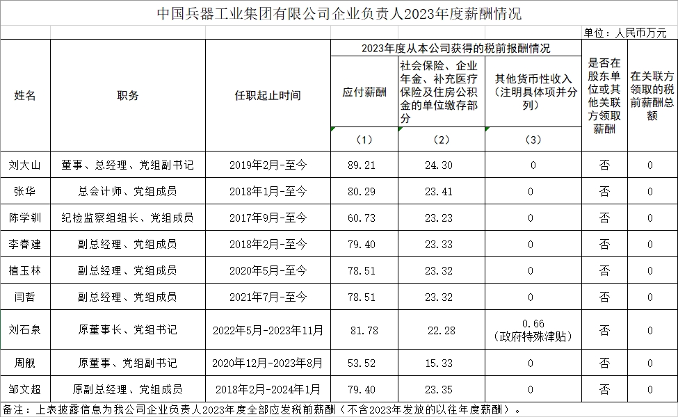 中國兵器工業(yè)集團(tuán)有限公司企業(yè)負(fù)責(zé)人2023年度薪酬情況
