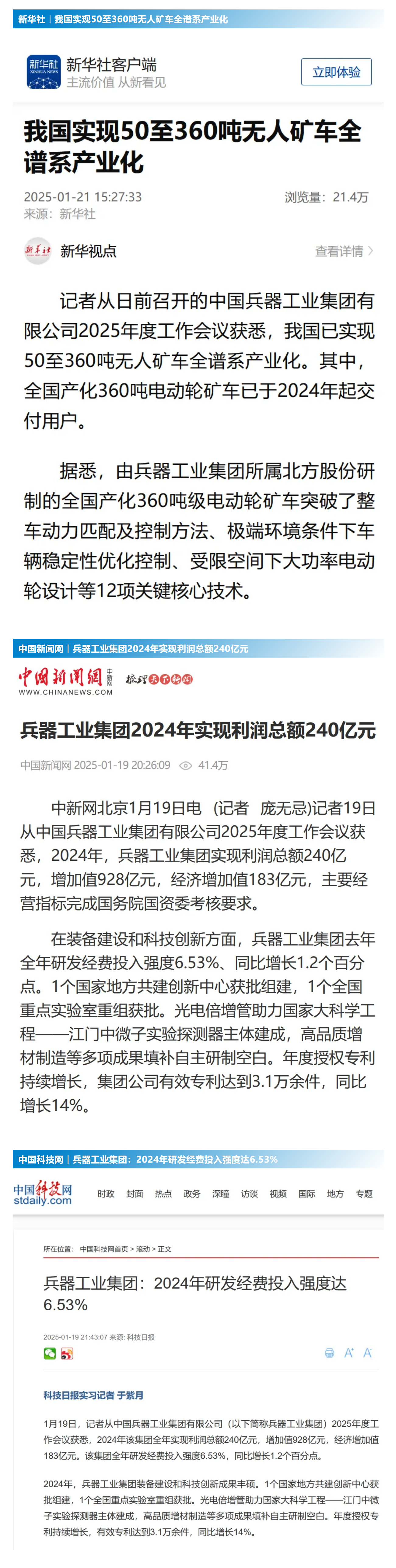 1月19日至20日,中國兵器工業(yè)集團(tuán)有限公司2025年度工作會(huì)議在京召開,會(huì)議總結(jié)2024年工作,分析形勢任務(wù),明確工作思路,部署2025年工作。 集團(tuán)公司2024年取得的成績及下一步重點(diǎn)工作受到社會(huì)媒體廣泛關(guān)注。新華社、中國新聞網(wǎng)、中國科技網(wǎng)、光明日?qǐng)?bào)客戶端、經(jīng)濟(jì)日?qǐng)?bào)客戶端、中國日?qǐng)?bào)網(wǎng)、國務(wù)院國資委網(wǎng)站、學(xué)習(xí)強(qiáng)國中央企業(yè)學(xué)習(xí)平臺(tái)、新浪網(wǎng)、網(wǎng)易網(wǎng)、搜狐網(wǎng)、騰訊網(wǎng)、鳳凰網(wǎng)等中央主流媒體、國家部委網(wǎng)站及知名網(wǎng)絡(luò)媒體對(duì)集團(tuán)公司2025年度工作會(huì)議進(jìn)行了報(bào)道,重點(diǎn)關(guān)注集團(tuán)公司經(jīng)營業(yè)績、科技創(chuàng)新、產(chǎn)業(yè)結(jié)構(gòu)布局優(yōu)化等情況。其中,新華社以《我國實(shí)現(xiàn)50至360噸無人礦車全譜系產(chǎn)業(yè)化》為題,重點(diǎn)報(bào)道了集團(tuán)公司在推動(dòng)智能制造水平提升方面取得的成效;中國新聞網(wǎng)、光明日?qǐng)?bào)客戶端、經(jīng)濟(jì)日?qǐng)?bào)客戶端、中國日?qǐng)?bào)網(wǎng)等就集團(tuán)公司2024年度經(jīng)營業(yè)績及各項(xiàng)工作取得的成果進(jìn)行報(bào)道;中國科技網(wǎng)著重報(bào)道了集團(tuán)公司在科技創(chuàng)新和優(yōu)化產(chǎn)業(yè)結(jié)構(gòu)布局方面的最新進(jìn)展。集團(tuán)公司門戶網(wǎng)站、微信公眾號(hào)、微博等新媒體平臺(tái)以及《中國兵工報(bào)》也對(duì)集團(tuán)公司工作會(huì)議進(jìn)行了及時(shí)報(bào)道,各成員單位紛紛對(duì)相關(guān)內(nèi)容進(jìn)行轉(zhuǎn)載,引發(fā)全系統(tǒng)關(guān)注。 集團(tuán)公司職工及廣大網(wǎng)友熱議工作會(huì) “2025年工作會(huì)為我們指明了發(fā)展方向、明確了奮斗目標(biāo),面對(duì)全新的機(jī)遇和挑戰(zhàn),作為兵工人深感責(zé)任重大?!?/p> “科技是第一生產(chǎn)力,一定要以科技創(chuàng)新引領(lǐng)新質(zhì)生產(chǎn)力發(fā)展,為高質(zhì)量發(fā)展提供支撐?!?/p> “把各項(xiàng)工作做深、做實(shí)、做細(xì),努力為集團(tuán)公司高質(zhì)量發(fā)展添磚加瓦?!?/p> “2024年中國兵器展示了大國重器,祝新的一年中再創(chuàng)輝煌!” |